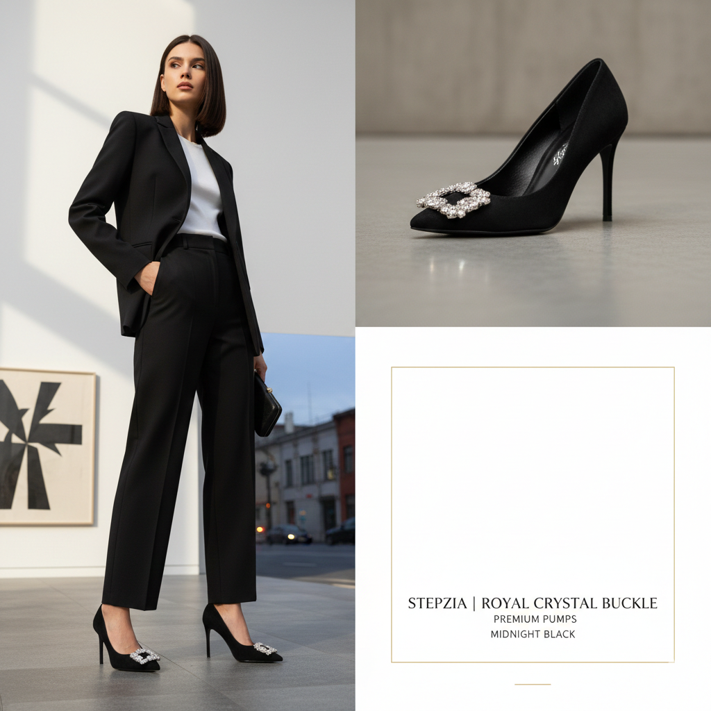 Stepzia | Royal Crystal Buckle Pointed-Toe Stiletto Pumps – Midnight Black